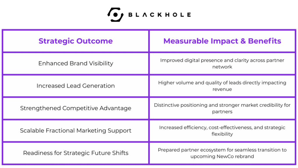 The impact of this approach was immediate and meaningful. Partners who previously struggled with marketing now benefited from strategic, professional marketing support, enabling them to effectively pursue new business opportunities without significant internal overhead.